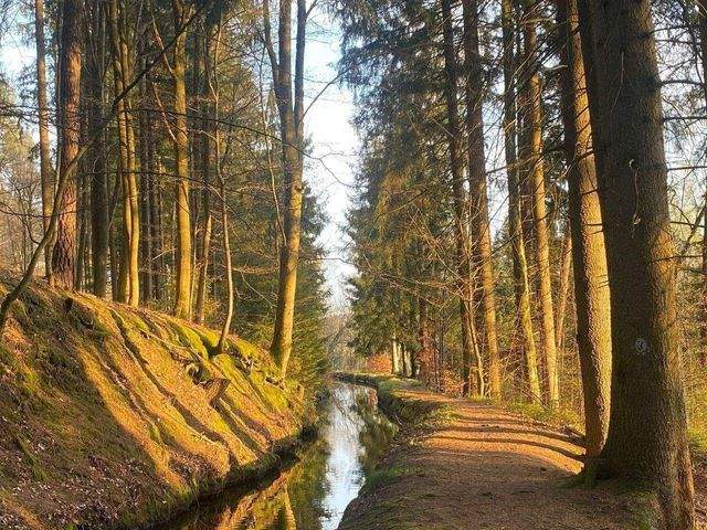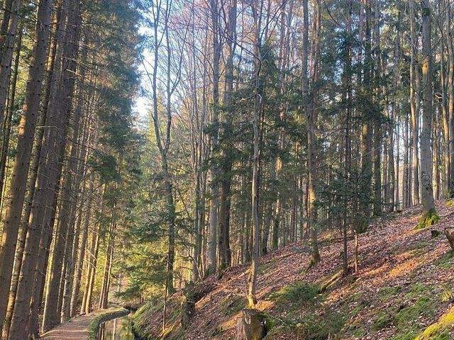 Durch den gesamten Wald schlängelt sich ein Bachlauf. Der rechts vom Bach gelegene
