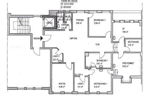 - RaumaufteilungEmpfang, 6 Räume, 3 Abstell-/Archivräume, 2 WC, Kellerraum